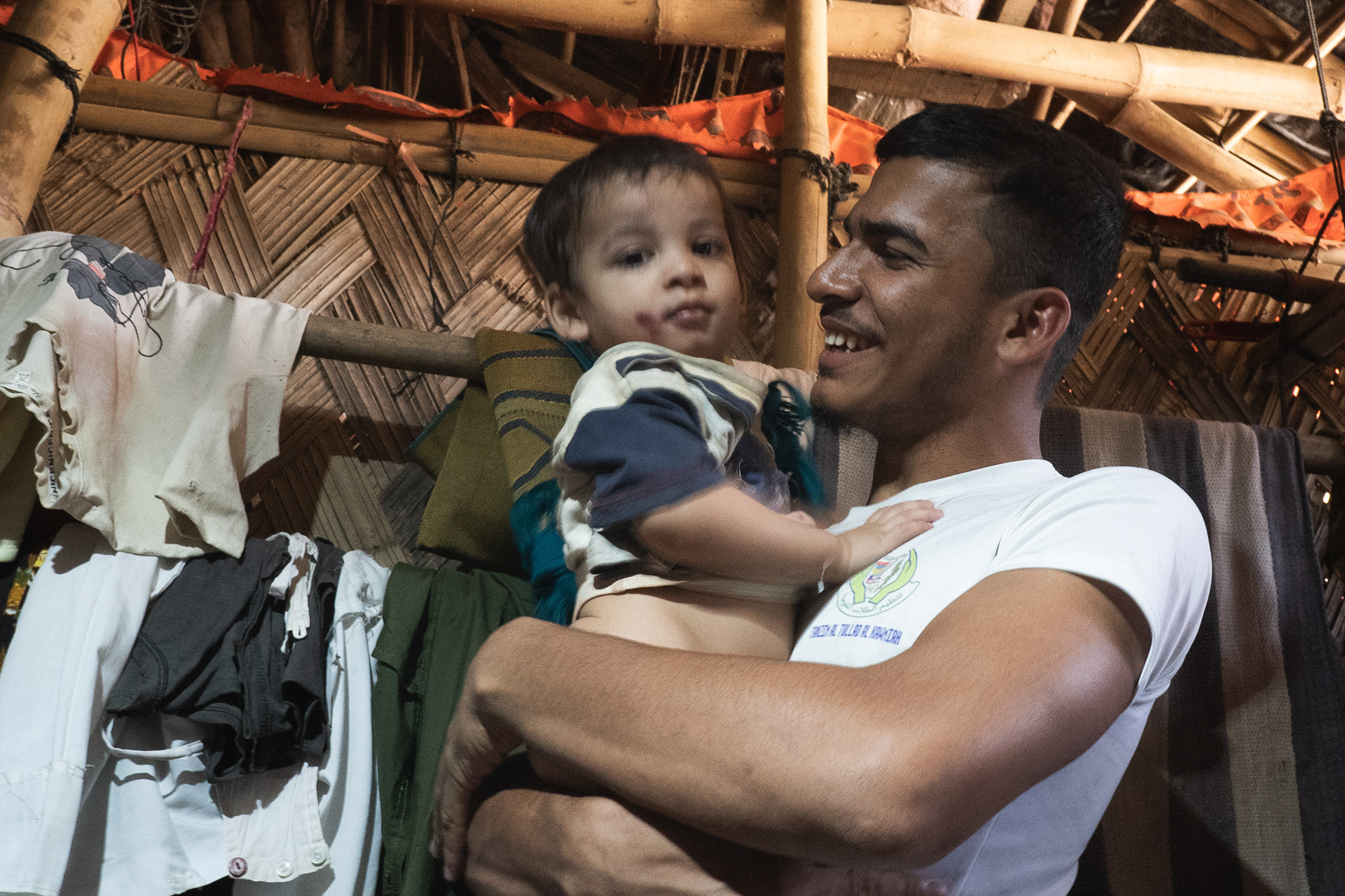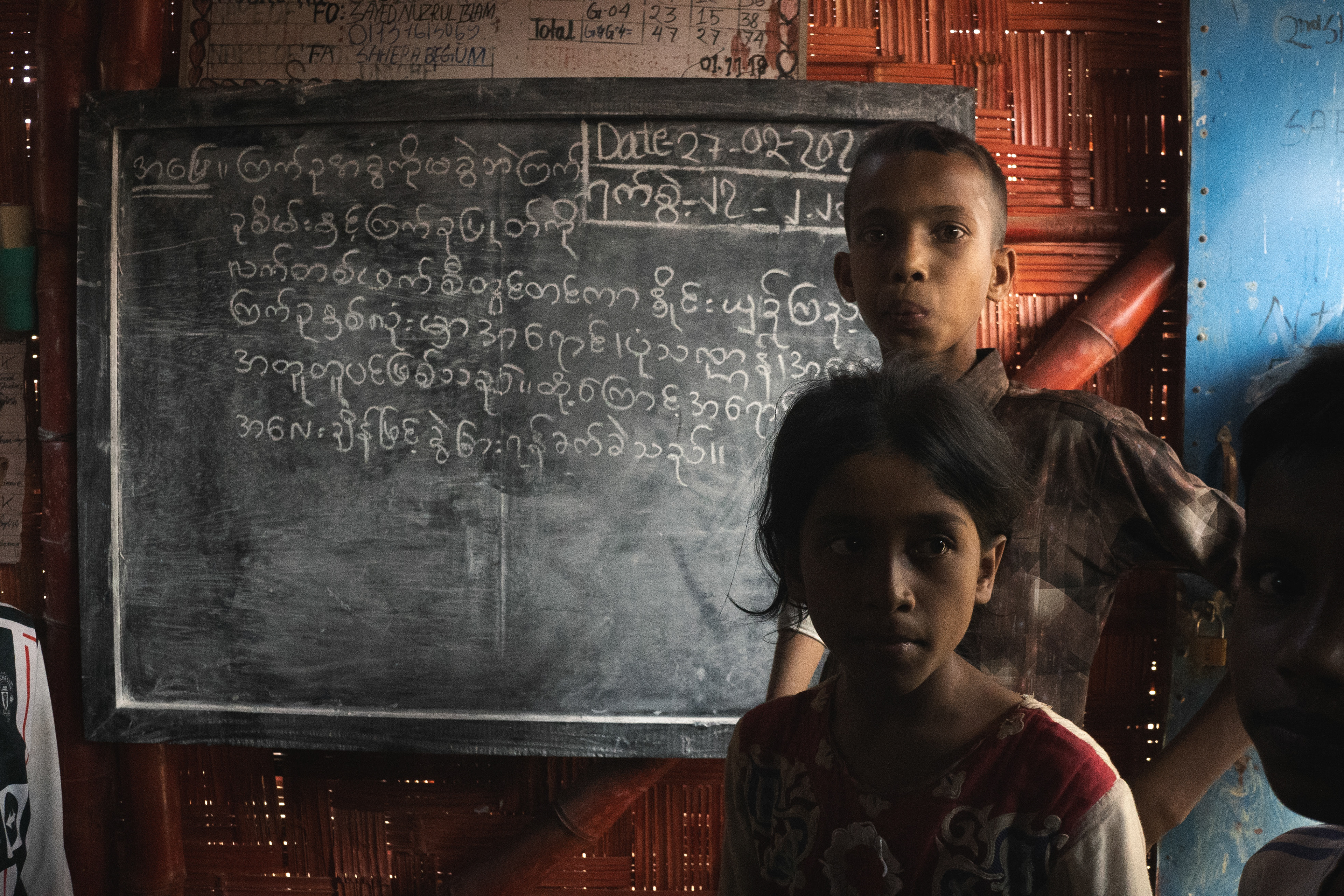 Rohingya youth peeking through a bamboo-stairwell in a primary school